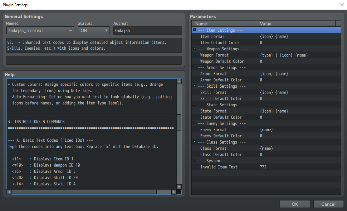 Kadajah's IconText v2.1 completely streamlines how you display database information. Instead of hard-coding text and looking up icon indexes, this plugin allows you to use simple, logical shortcodes like <i1> or <w50>.